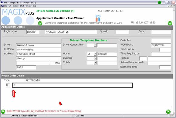 At the screen where you enter the Work to be done, you will see the prompt at the bottom of the screen say or ? to see Menu Pricing. Type R in the Type and ? in the WTBD Code as shown.